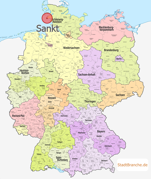 Sankt ist ein vorangestellter Namenszusatz, der eine Person als Heiligen kennzeichnet. Es handelt sich um die eingedeutschte Form des lateinischen sanctus, sancta, sanctum, heilig. Dem entspricht ital. san, santo, santa, santi; franz. saint, sainte, saints, saintes; engl. saint, neugriech. ????? ágios, ???? agía. Das lateinische Wort sanctus bedeutete ursprünglich ? abgegrenzt? und bezog sich auf Tempel und heilige Bezirke .| Landkreis | Landkreis Nordfriesland |