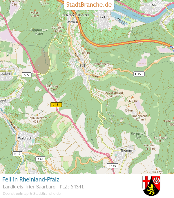 Fell (Gemeinde in Trier-Saarburg/Rheinland-Pfalz) gilt als Kleinstadt / Landstadt in Rheinland-Pfalz. Fell als Kreisangehörige Gemeinde hat 2.498 Einwohner auf einer Fläche von 15,73 Quadratkilometern, das ergibt 159 Einwohner je km² - eine Bevölkerungsdichte im Bereich gering besiedelt.
